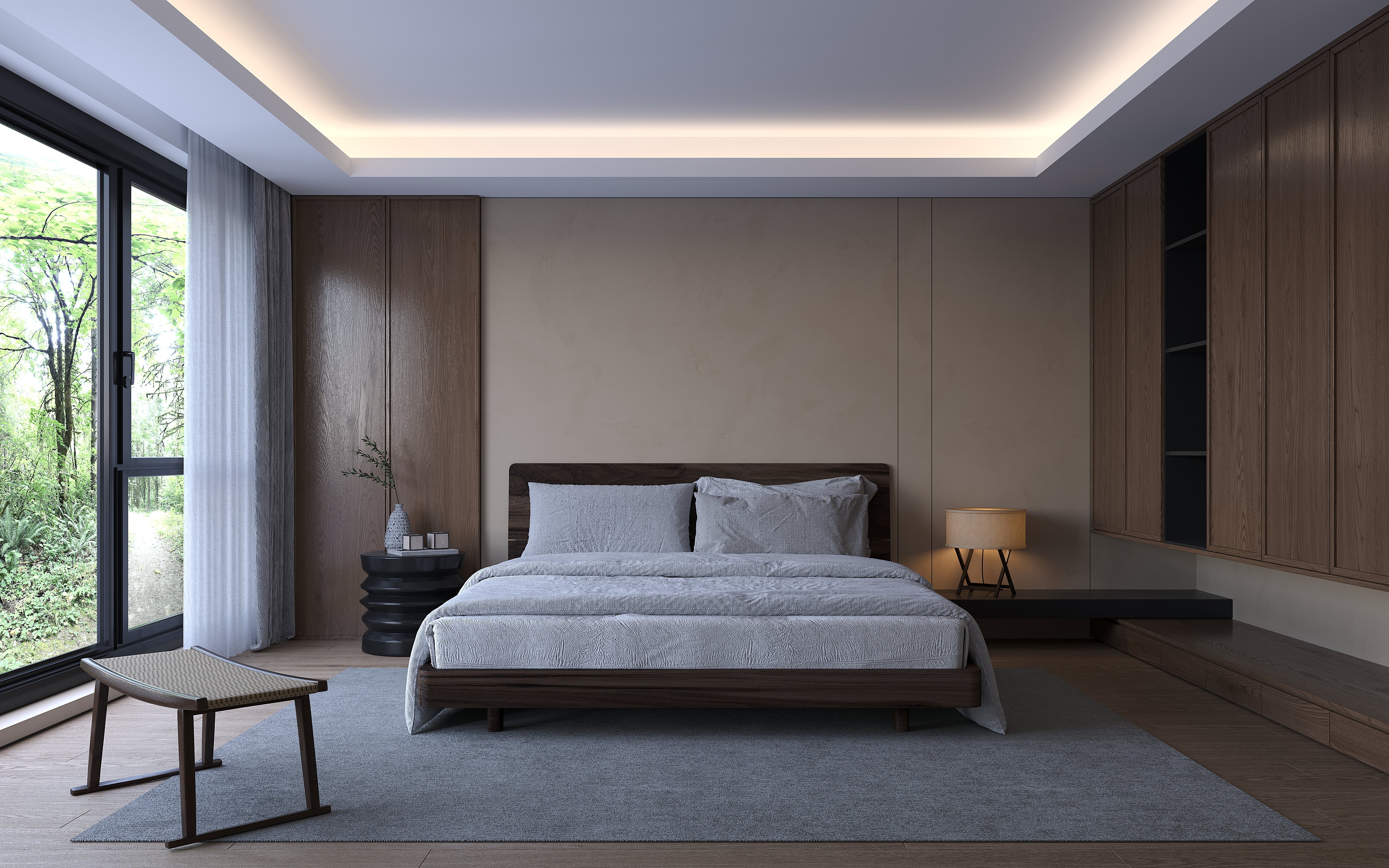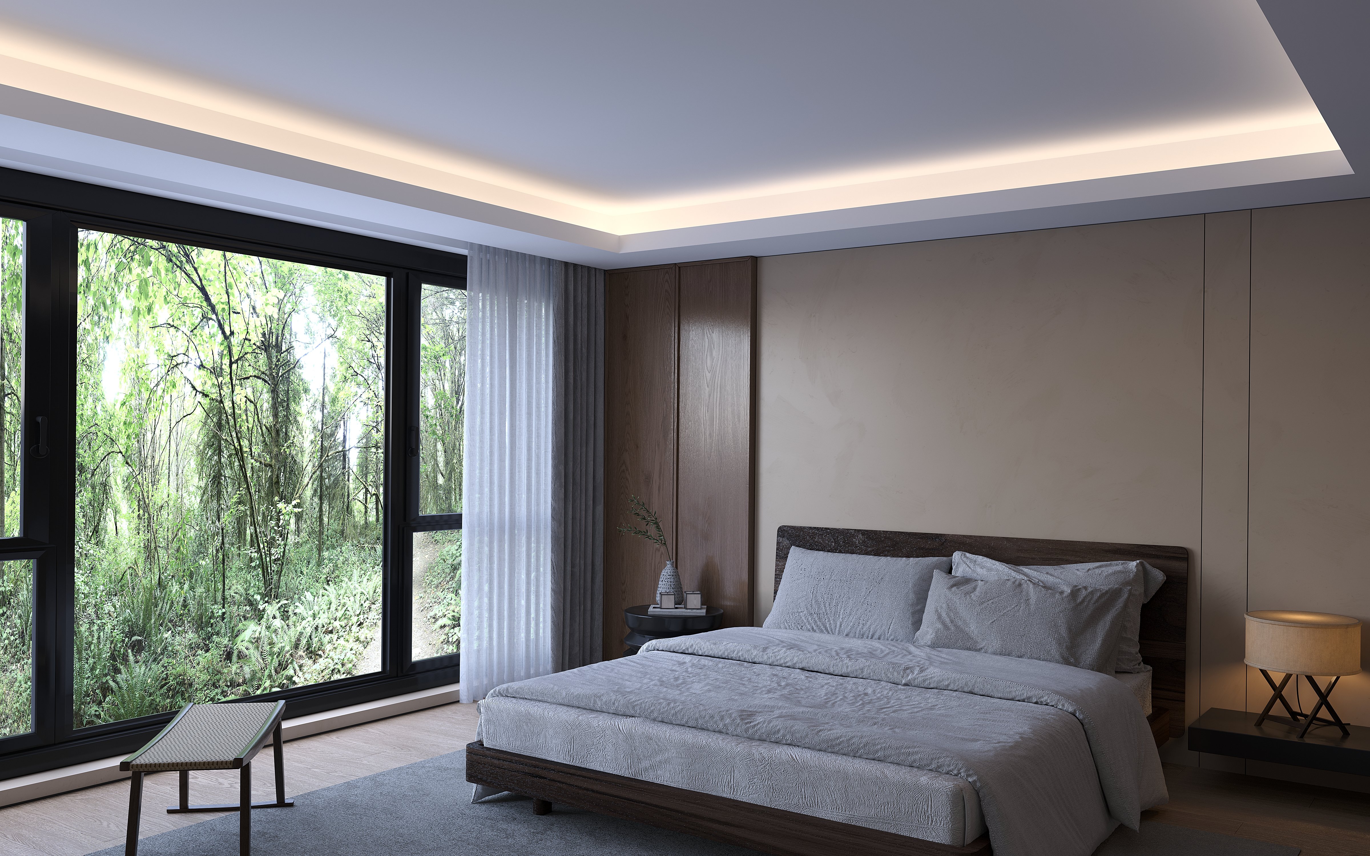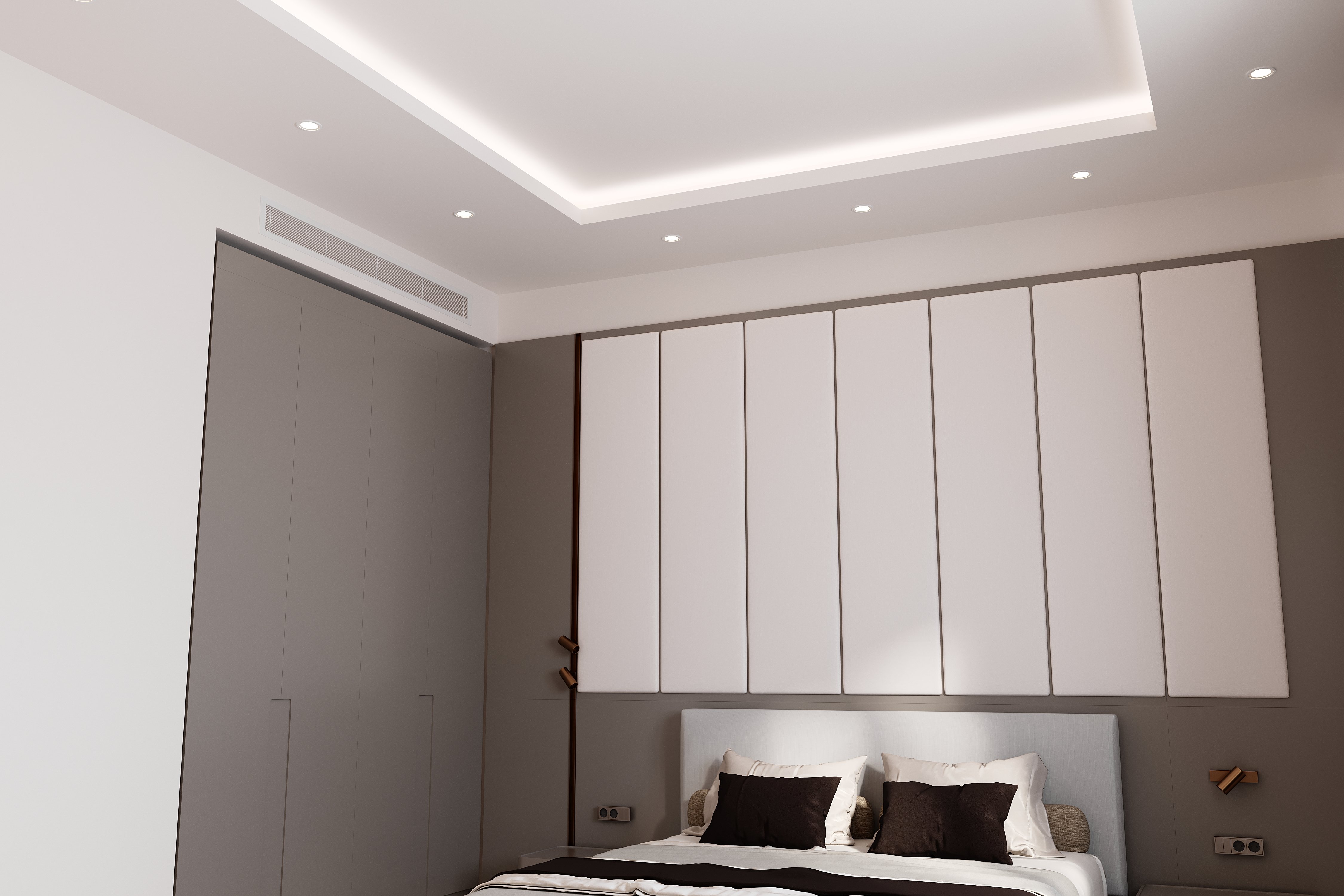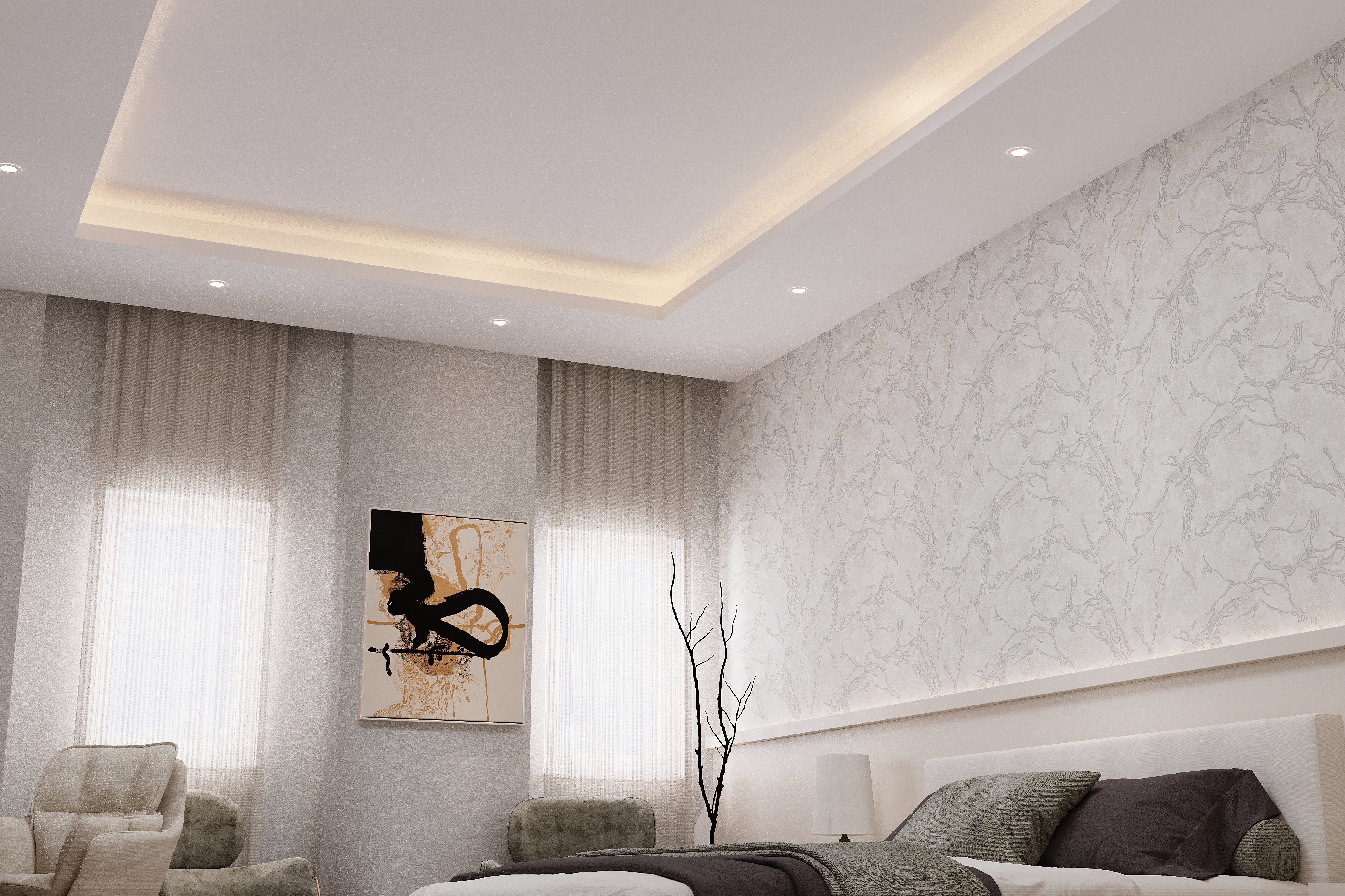Het moderne plafondontwerp met verzonken verlichting versterkt de ruime en elegante uitstraling van de kamer. Gelaagde lichtarrangementen creëren een zachte sfeer en tillen de algehele esthetiek van de ruimte naar een hoger niveau. Afgewerkt met minimalistische lijnen biedt dit plafondsysteem een oplossing die zowel modern als functioneel is. De plafondstructuur kan worden afgestemd op diverse ruimtelijke behoeften en op verzoek worden aangepast.